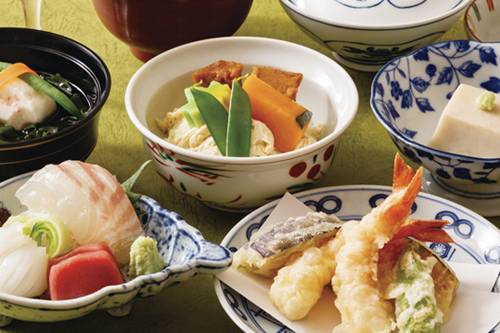 前菜、造り、天ぷら盛り合わせ、お食事(赤だし)、デザート